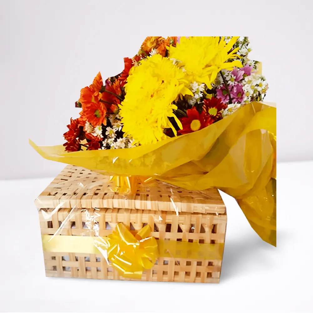 Cesta Chá da Tarde 40 Itens com Buquê Flores do Campo naturais. Um presente encantador que transmite cuidado, afeto e alegria.